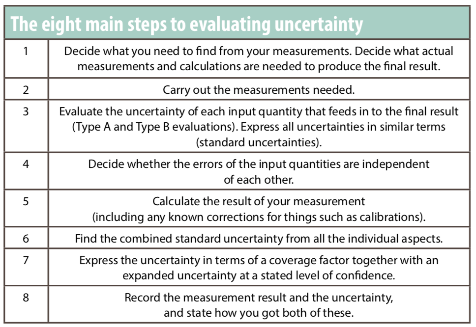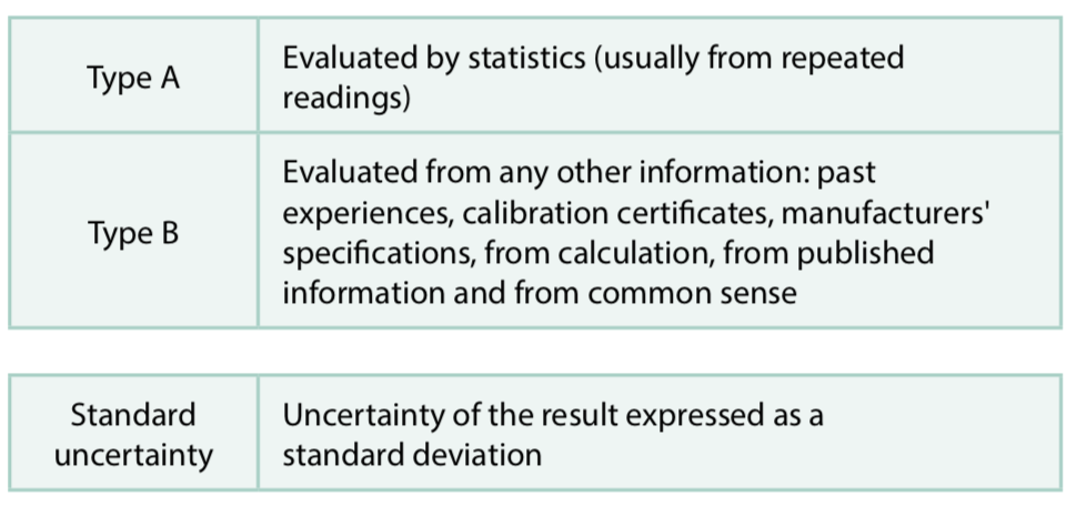 3. Evaluate the uncertainty of each input quantity that feeds in to the final result (Type A and Type B evaluations). Express all uncertainties in similar terms (standard uncertainties)¶