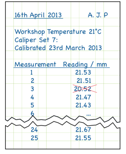 a date, name, the instruments, a note of the calibration sticker on the calipers, and a record of the temperature. This is good practice and pays off by 5% bonus for lab notebooks