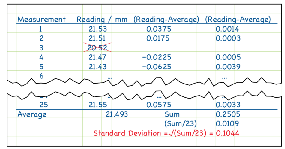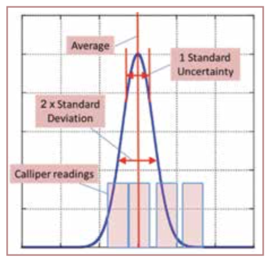 The best estimate of the length is the average of the 24 readings. The associated standard uncertainty is evaluated by combining (in quadrature) the standard uncertainties relating to the main factors that could cause the calipers to read incorrectly.